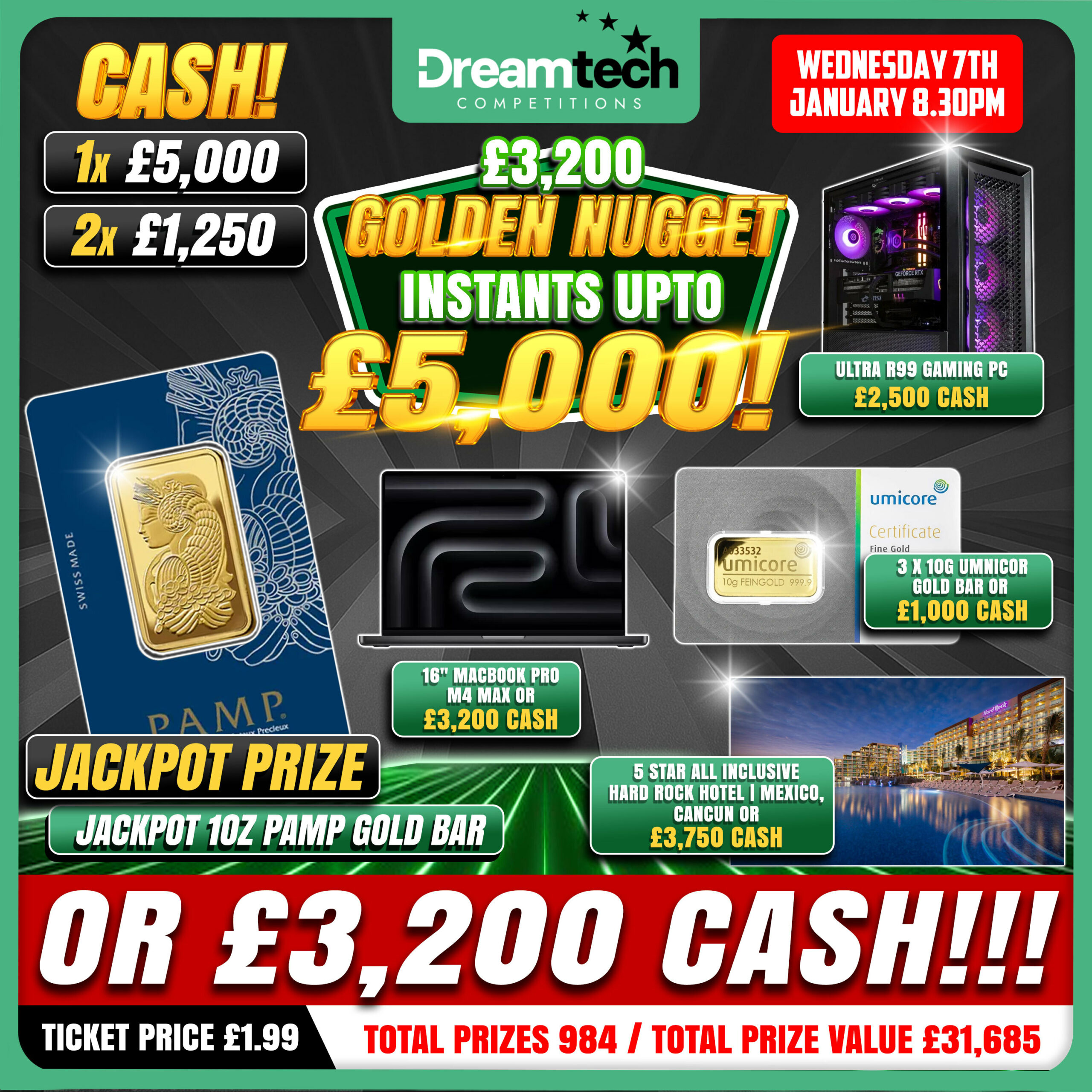 GOLDEN NUGGET or £3,200 JACKPOT + £28,485 Worth of Instants upto £5,000!