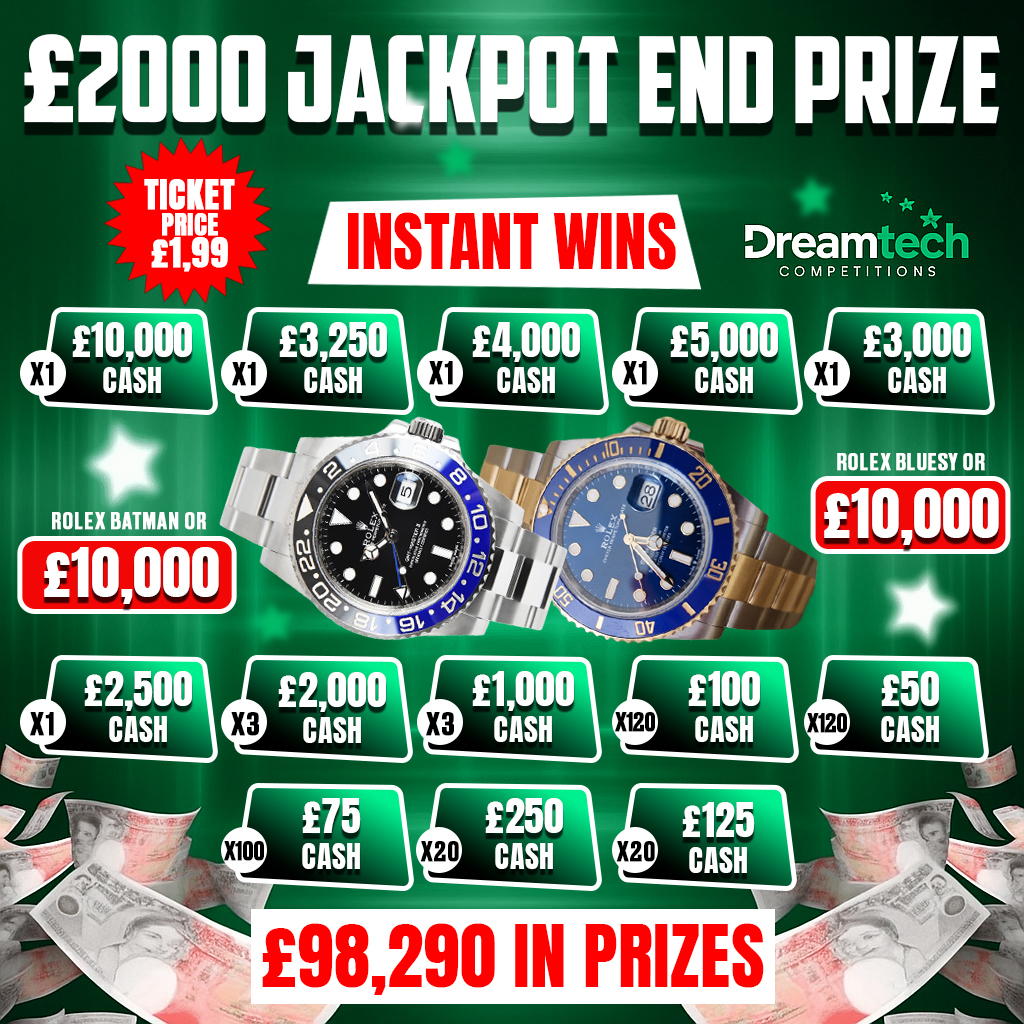 HUGE Rolex’s & Cash Upto £10,000 Instant Win | 2,316 Prizes | £98,290 in Prizes + £2,000 Jackpot
