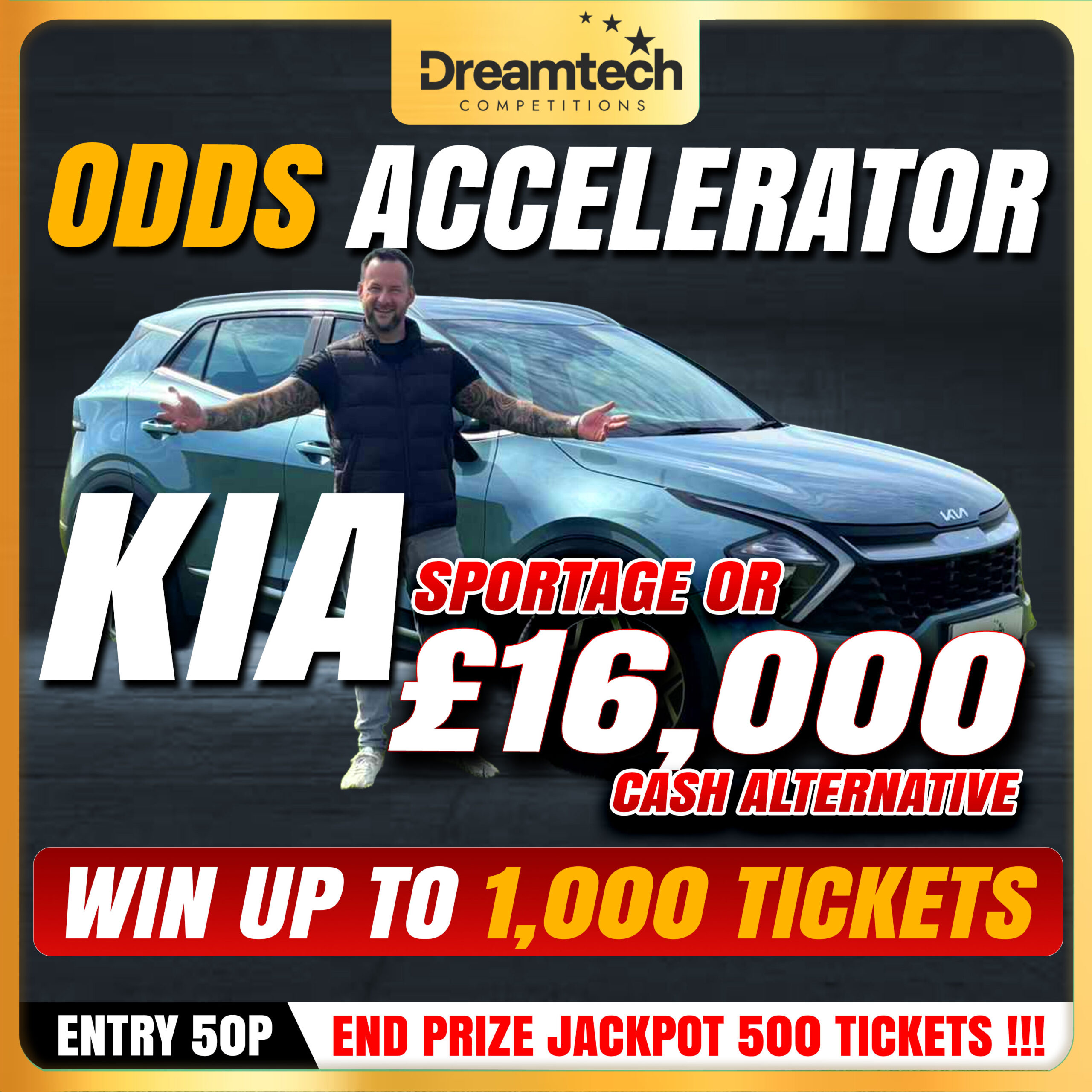 Kia Sportage or £16,000 Cash ODDS BOOSTER – 500 Ticket End Prize