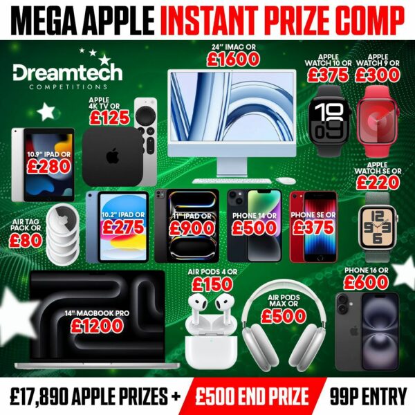 The live draw will take place on the DreamTech Competitions Ltd Facebook page using Google’s random number generator to select the winning ticket number from all Entrants.