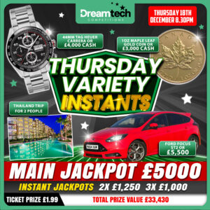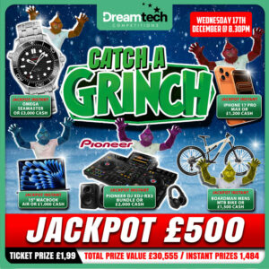 The live draw will take place on the DreamTech Competitions Ltd Facebook page using Google’s random number generator to select the winning ticket number from all Entrants.