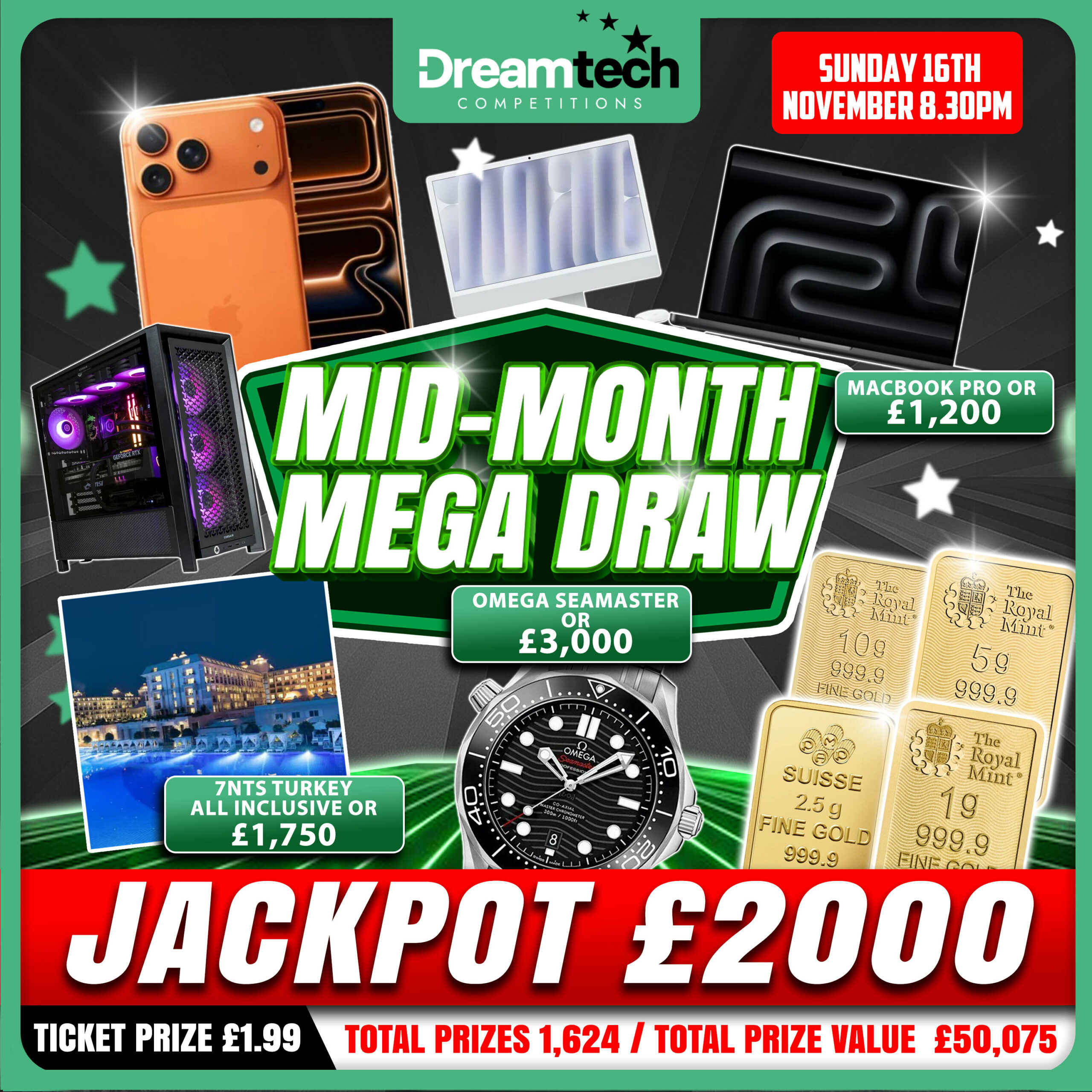 The live draw will take place on the DreamTech Competitions Ltd Facebook page using Google’s random number generator to select the winning ticket number from all Entrants.