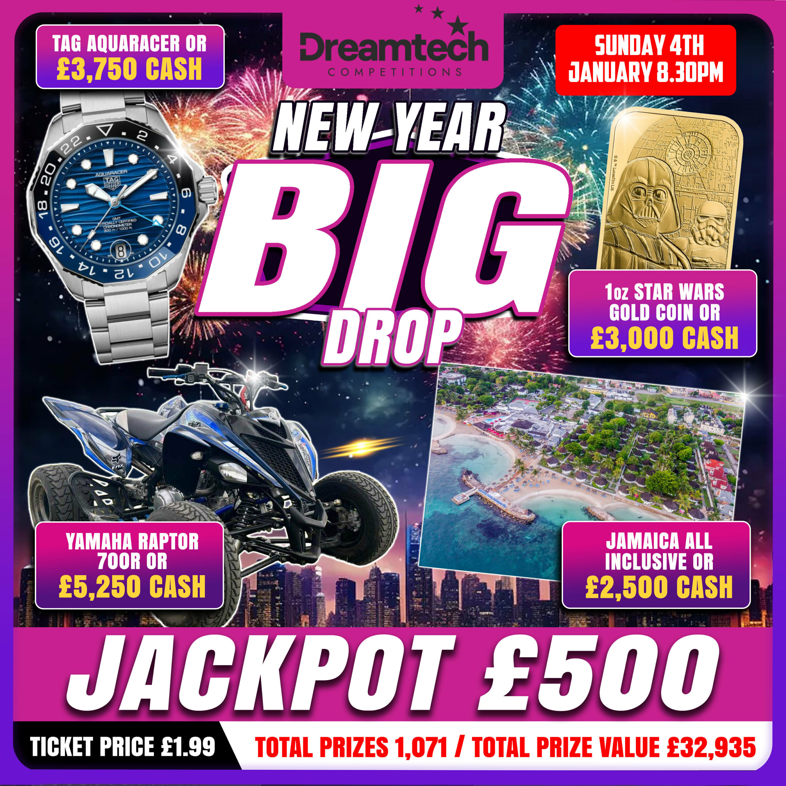 The live draw will take place on the DreamTech Competitions Ltd Facebook page using Google’s random number generator to select the winning ticket number from all Entrants.