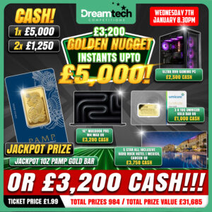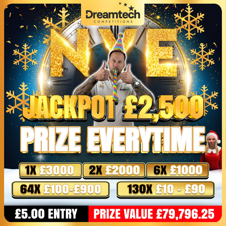 The live draw will take place on the DreamTech Competitions Ltd Facebook page using Google’s random number generator to select the winning ticket number from all Entrants.