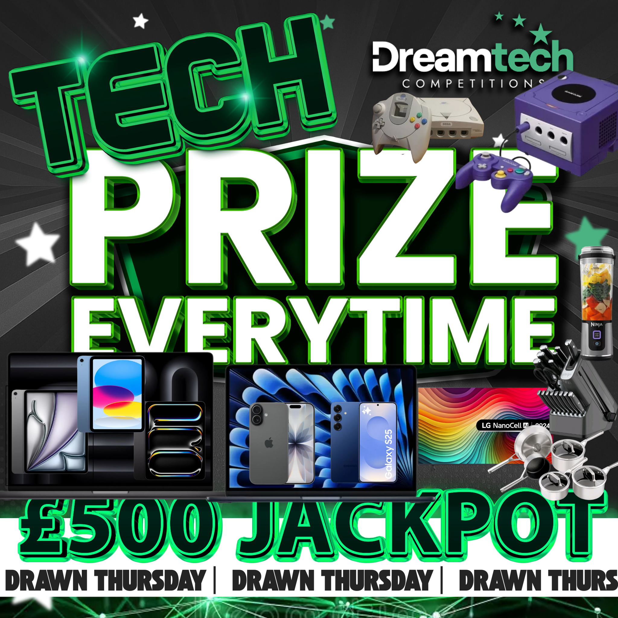 The live draw will take place on the DreamTech Competitions Ltd Facebook page using Google’s random number generator to select the winning ticket number from all Entrants.