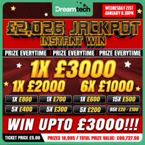 The live draw will take place on the DreamTech Competitions Ltd Facebook page using Google’s random number generator to select the winning ticket number from all Entrants.