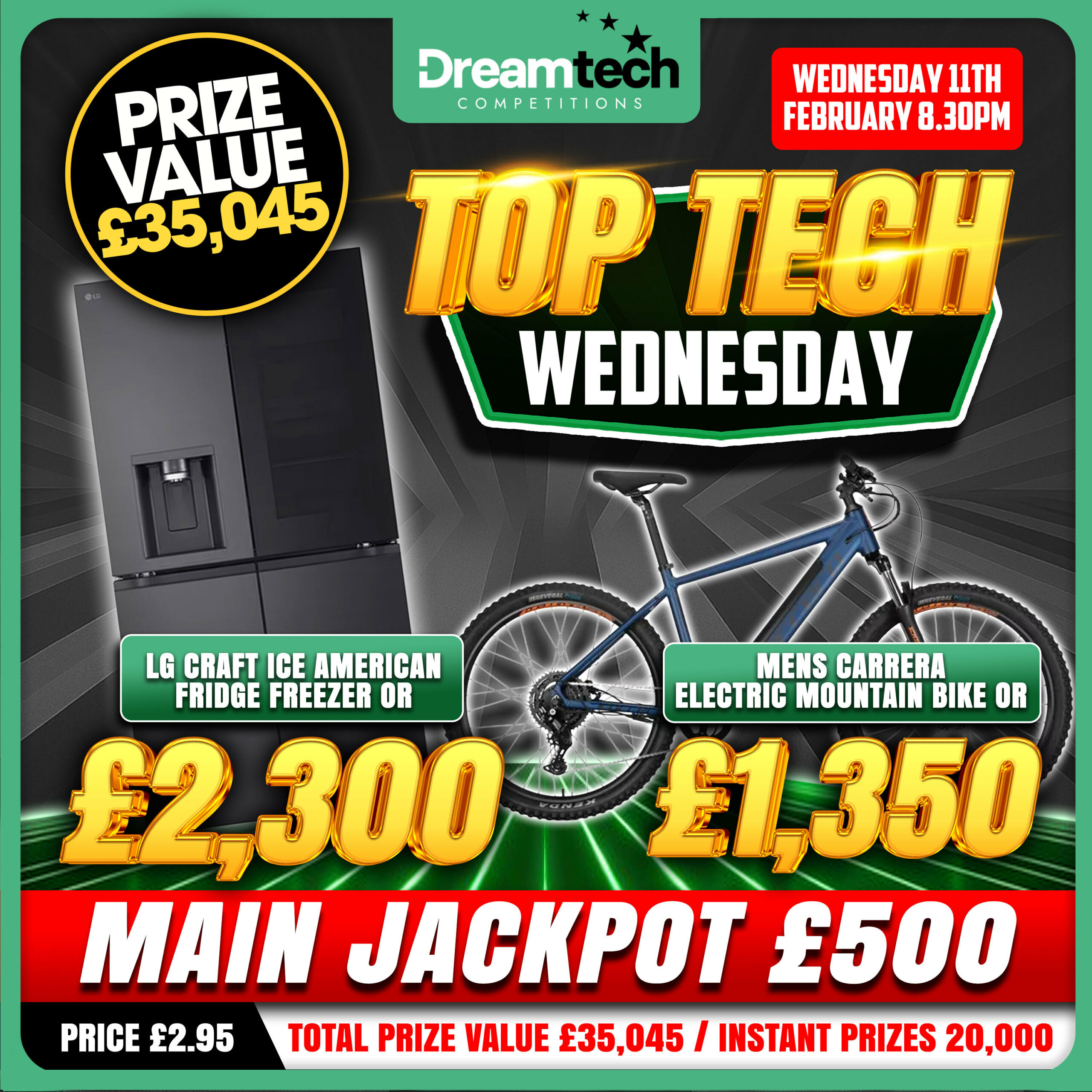 The live draw will take place on the DreamTech Competitions Ltd Facebook page using Google’s random number generator to select the winning ticket number from all Entrants.