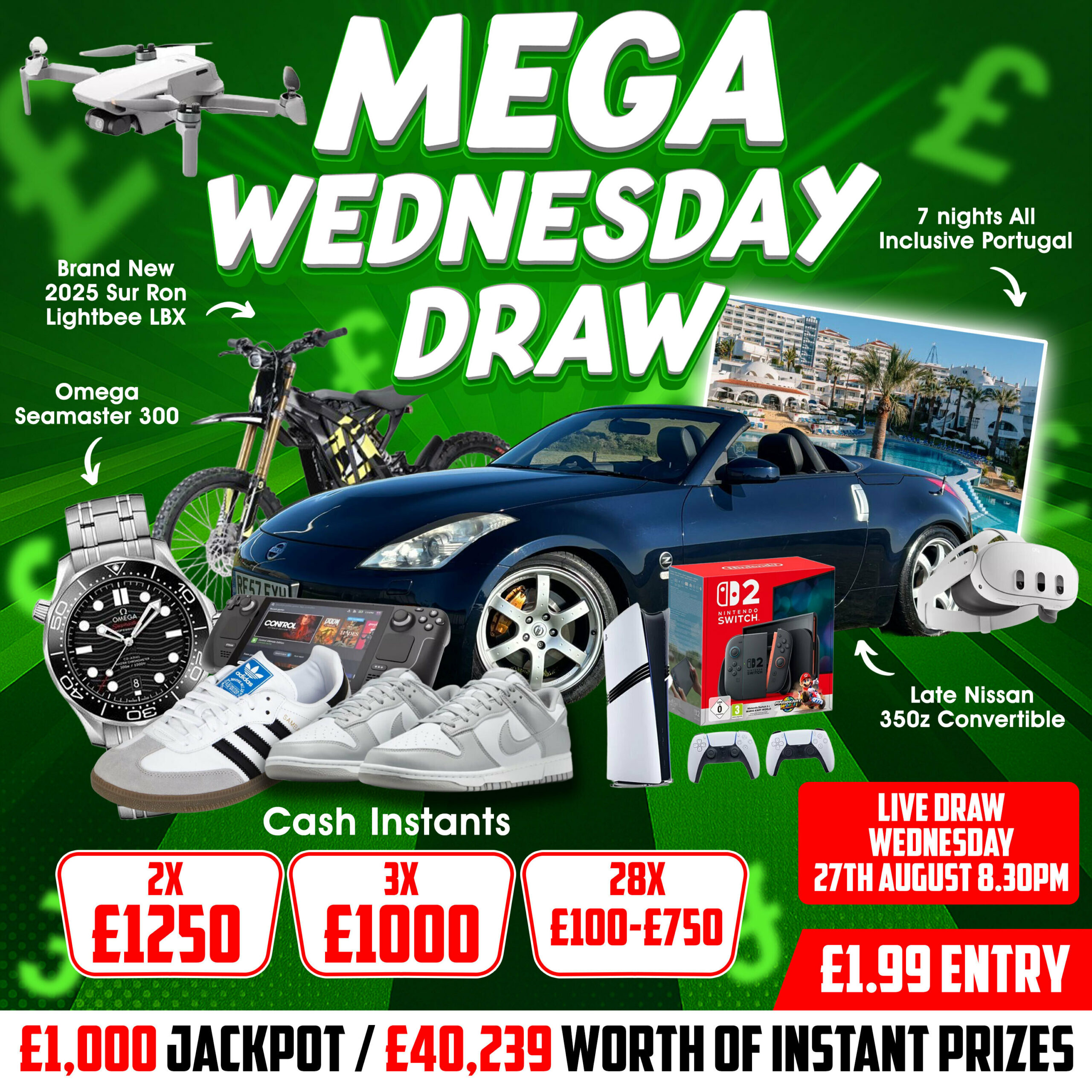 The live draw will take place on the DreamTech Competitions Ltd Facebook page using Google’s random number generator to select the winning ticket number from all Entrants.
