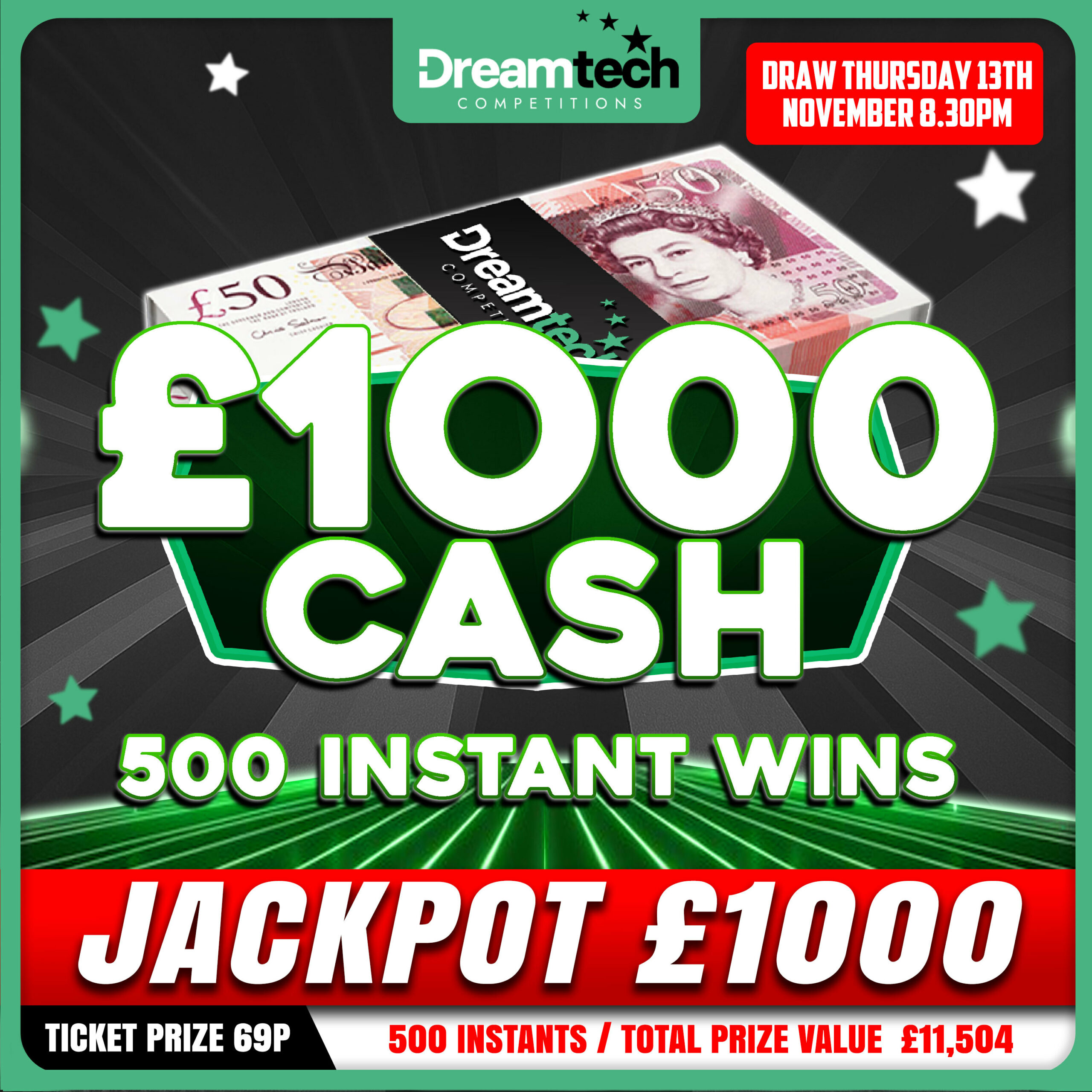 The live draw will take place on the DreamTech Competitions Ltd Facebook page using Google’s random number generator to select the winning ticket number from all Entrants.